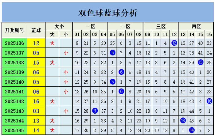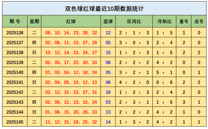 上期转头:双色球第2025145期开出奖号:红球11、12、15、18、25、32;蓝球14,其中红球三区比为1:3:2,开出1枚重号15,开出1组连号11、12,蓝球开出四区号码14。